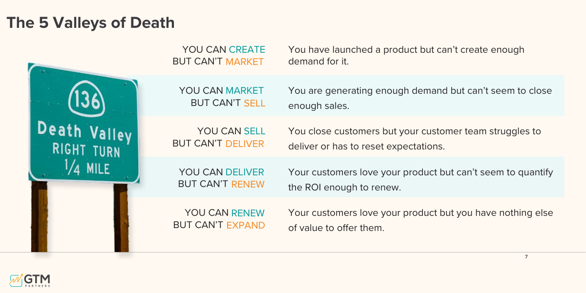 Every single company goes through one or more of the 5 Valleys of GTM Death. Some go through all of them. Most encounter them again and again whenever they launch a new product, service, or motion.