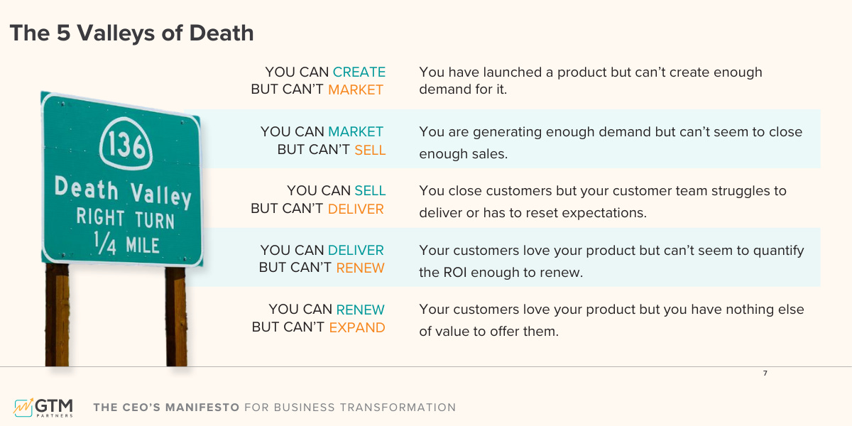 Functional leaders experience these problems every day: churn, POV, prioritization. Boards and CEOs, though, experience them differently: as big-picture “Valleys of Death” that threaten growth.